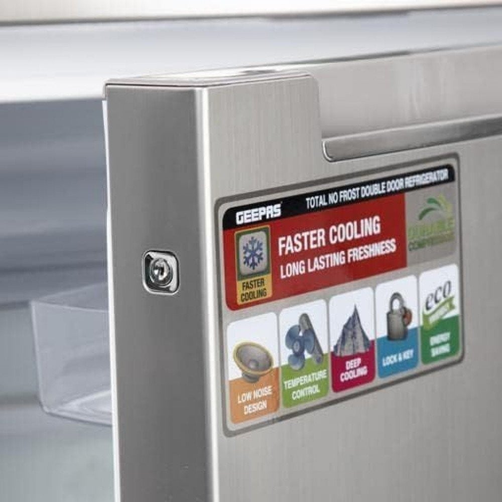 ابق منتعشًا ، حافظ على صحتك. تقدم لك Geepas ثلاجة ذات باب مزدوج بمظهر ممتاز بسعة كبيرة تبلغ 500 لتر ، وهي مناسبة تمامًا لعائلتك. تأتي الثلاجة بتصميم حيث توجد الثلاجة في الأسفل والفريزر في الأعلى. هذه الثلاجة مصنوعة من مواد عالية الجودة ولها طبقة نهائية ممتازة من الستانلس ستيل. إنها قوية ومتينة وفعالة ومصممة لتدوم. يمكن أن تتناسب الثلاجة بسهولة مع منزلك أو شقتك أو غرفتك أو منطقة تناول الطعام أو المطبخ وتحافظ على طعامك ومشروباتك طازجة وباردة وصحية. يبرد المحتويات بالتساوي ويحافظ عليها طازجة لفترة طويلة. تتميز الثلاجة ذات الباب المزدوج بتقنية منع التجمد بالكامل ، لذلك لا داعي للقلق بشأن إذابة الجليد من المحتويات بالداخل.
