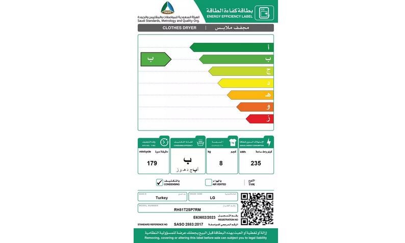 سعة التجفيف: 8 كيلو جرام